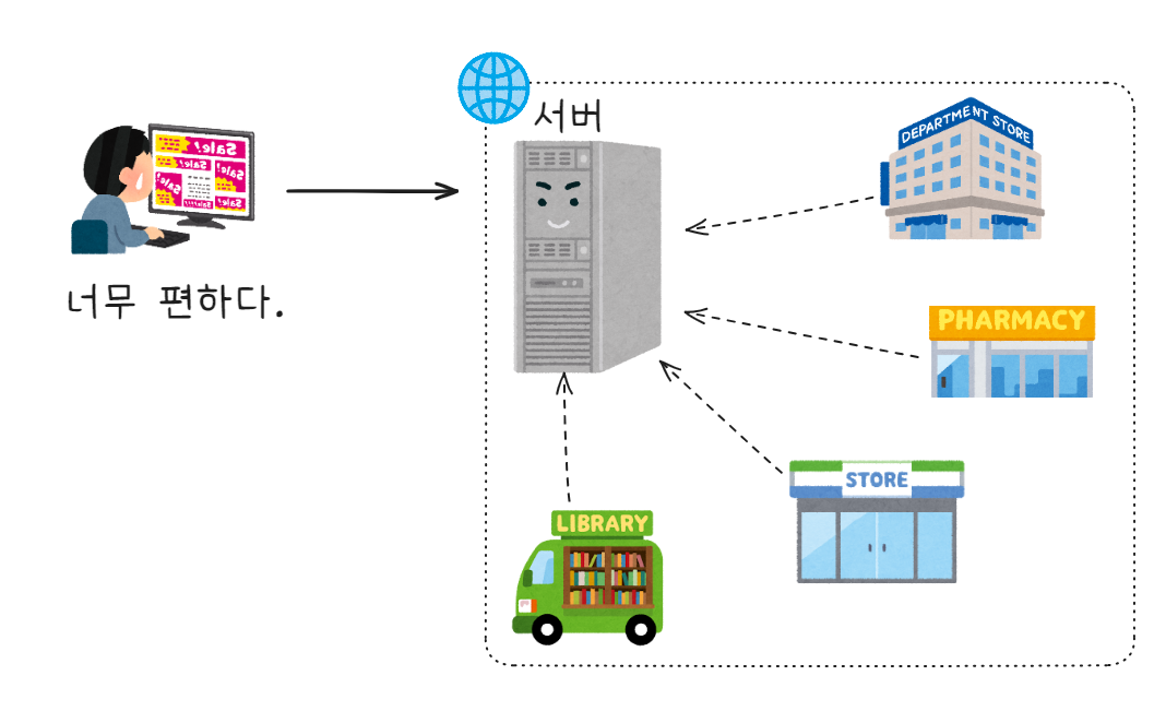 사용자는 하나의 웹 사이트에서 각종 마켓에 있는 물품 구매할 수 있다. 사용자 입장에서는 불편하게 다른 사이트를 왔다갔다 할 필요 없이 하나의 서비스에서 모든 것을 상호작용 할 수 있다.